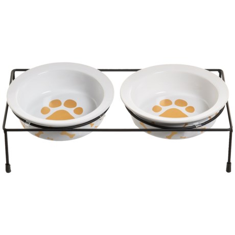 CLOSEOUTS . This Doghaus lined black paw print ceramic elevated dog feeder makes it easier for your dog to swallow food and water, plus it helps reduce the mess your pet makes when sheand#39;s chowing down. Available Colors: BLACK.