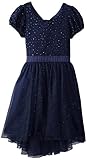 Scoop-neck short-sleeve dress in full skirt silhouette with lace overlay on bodice