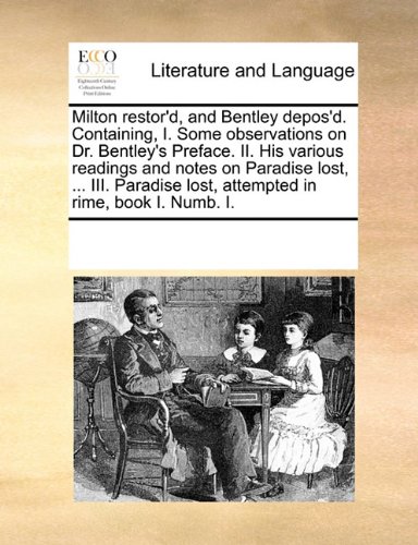 Milton restor'd, and Bentley depos'd. Containing, I. Some observations on Dr. Bentley's Preface. II. His various readings and notes on Paradise lost, ... lost, attempted in rime, book I. Numb. I.