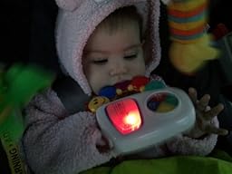 - The volume can be set at two levels, which is a nice feature. - The Music is varied and enjoyable for both baby and adults. - The Handle is a good size for baby to grab, yet works as a chew option for teething. * It's not great for teething, but it contributes to the versatility of the toy. - The light show that it puts on is incredibly effective at keeping baby entertained. You'd think it would give her a seizure, but it manages to just entertain.