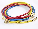 5 Ft Red(1/4" SAE), Yellow(1/4" SAE) & Blue(1/4" SAE) Charging Hoses Working Pressure: 500 PSI / Burst Pressure: 2500 PSI HD Brass Made Hose Connections,Good for R410a and Most Other Refrigerants R22, R134a, R12, R502 Designed to Meet 1/4" SAE Requirement for Refrigerant Permutation 45 Degrees Angle on the Service Port Site for Easier Access 5 Ft Red(1/4" SAE), Yellow(1/4" SAE) & Blue(1/4" SAE) Charging Hoses Working Pressure: 500 PSI Burst Pressure: 2500 PSI Heavy Duty Brass Made Hose Connections Designed to Meet 1/4" SAE Requirement for Refrigerant Permutation 45 Degrees Angle on the Service Port Site for Easier Access Good for R410a and Most Other Refrigerants Like R22, R134a, R12, R502... Package Included: 3 x 60" Color Coded Charging Hoses