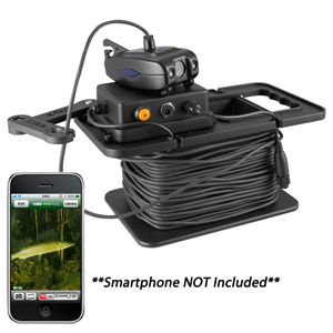 Now anyone with a smart phone or tablet will get a high quality video image delivered right to the palm of your hand. Using Wi-Fi signal technology to create its own hotspot that reaches out 100 feet in all directions, so you can share your video signal with as many friends as you like or keep it totally secure. You dont need cell phone coverage to use it, the FishPhone works anywhere in the world. The FREE software App is downloaded from the App store and works with both Android and IOS systems. FishPhone is a stand alone, fully functional, Smart Phone controlled system that allows you to record video or still images and easily send it off to your friends in an e-mail or text. The FishPhone comes with a unique holder and battery pack system that makes it easy to carry and manage 50' of cable. The portable FishPhone pack system can power your FishPhone for six hours between charging. The camera used in the FishPhone system is a Sony Color/ B&W camera that automatically shifts from color to black and white when light conditions are limited to increase contrast. There is little doubt underwater camera technology is getting lighter and more portable and with the FishPhone, Vexilar will be changing the way people look at underwater camera systems. Features: Compatible with iOS 6, Android 2.0 Color/B&W CMOS Camera 50' lightweight cable 6-hour run time per charge 12V battery and charger Ridge case Records still images and video Full spectrum light level controls 100 feet transmit Range Via Wi-Fi 2-year Vexilar Warranty Waterproof Rating = NONE , Reverse Image = NONE
