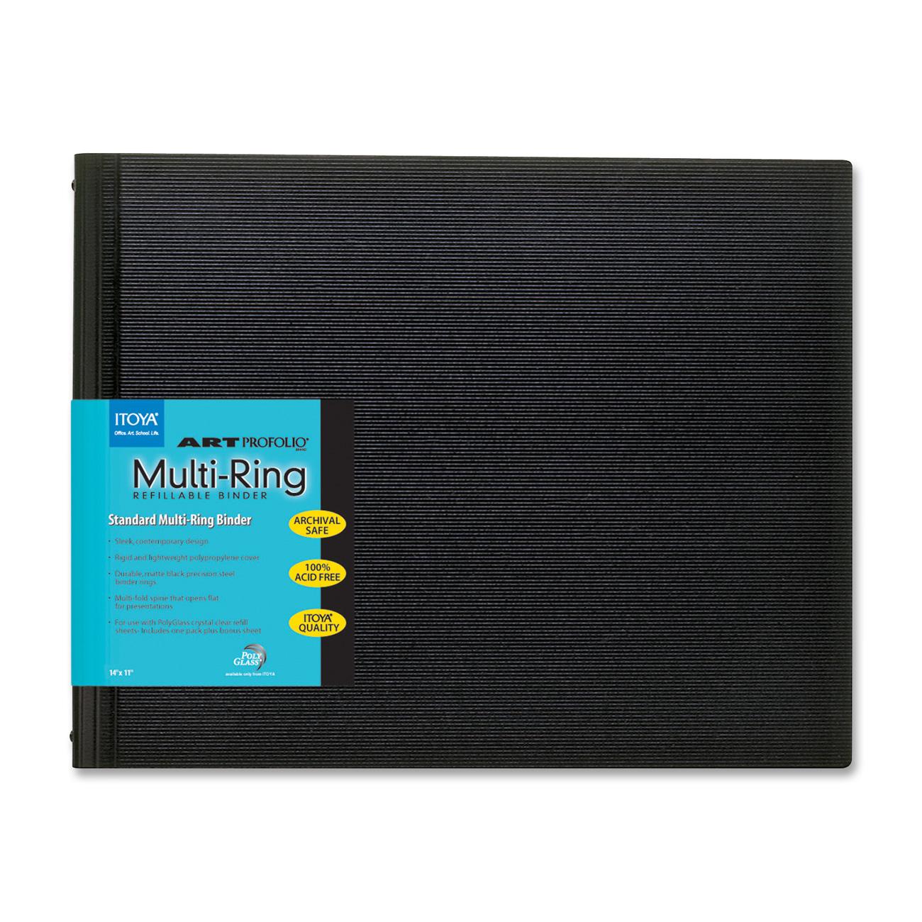 Multi-ring binder features a sleek exterior design with durable and matte black precision steel binder rings. Made from a unique and proprietary process, the polypropylene cover is rigid to protect the contents, yet lightweight for easy transport of your important presentations. A unique, center-mounted, multifold spine allows the binder to lie perfectly flat for presentations. Binder includes one pack plus bonus sheet with crystal-clear clarity and glass-smooth texture. Binder is refillable. Design is archival-safe and acid-free.