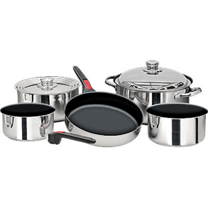 "10 Piece Stainless Steel ""Nesting"" Cookware Coated with Teflon Select Non-Stick Coatings The quality and value you've come to expect from all Magma products now in an 18-10 stainless steel cookware set that nests for storage in less than 1/2 cubic foot of cabinet space. This set features DuPont Teflon Select Non-Stick coatings for worry-free cooking and simple clean-up. The set includes three Sauce Pans (1-1/2 qt., 2 qt., and 3 qt.), a Lid that fits all three saucepans, a 5 qt. Stock Pot, a 9-1/2 inch diameter Saute Pan, a lid for the Stock Pot and Saute Pan, 2 removable handles, and a convenient Bungee storage cord. All have triple clad bottoms (stainless steel, aluminum, stainless steel) and are milled perfectly flat for even heat distribution on gas, electric or ceramic cooktops. All the cookware is oven safe and dishwasher friendly. Yacht quality cookware at a value price. "