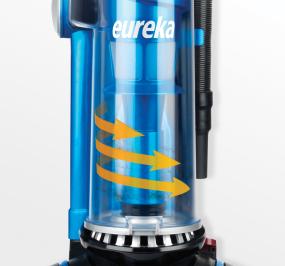 Designed to deep clean all floors AirSpeed Technology to move more air and remove more dirt for a deeper clean Never loses suction-maintains powerful suction while vacuuming High efficiency allergen filter reduces dust and allergens 38-ft total reach system with 11-ft stretch hose and 27 -ft. cord Eureka AS3008A Airspeed Exact Reach Bagless Upright Vacuum Moves More Air. Removes More Dirt. Experience Eureka power with Airspeed Exact Reach. Unlike most other vacuums, AirSpeed Exact Reach is engineered with an efficient air path with limited bends and turns. This allows more air to pass through the vacuum. The direct air path from floor to cup decreases the distance for dirt to travel, which increases the amount of airflow for powerful suction. For attachment cleaning, simply set the suction control dial to "tools". The floor nozzle features a 5-setting height adjustment switch combined with Eureka’s patented Smooth-Glide Pivoting Base making it easy to push over all carpet types. Deep clean stairs, furniture and upholstered furniture with ease with the 10-ft deluxe stretch hose, on-board Stair & Upholstery Turbo Nozzle, crevice tool, and dusting brush. Also included are a washable dust cup filter and a high efficiency allergen filter that reduces dust and allergens. Eureka has engineered AirSpeed Exact Reach to provide maximum suction power. Tested to strict industry standards, Eureka’s multi-cyclonic dust cup system never loses suction and maintains power as you vacuum your home. Deep Cleans Carpets and More 38 Ft. Total Reach System Deep Cleans Carpets and More AirSpeed Exact Reach is built to deep clean carpet, stairs and everywhere dirt hides. AirSpeed Technology Engineered to move more air and remove more dirt for a deeper clean. Never Loses Suction Maintains powerful suction while vacuuming. High Efficiency Allergen Filter The high efficiency allergen filter reduces dust and allergens. Never Loses Suction 38 Ft. Total Reach System A 27 foot cord and 11 foot deluxe stretch hose and extension wand. Additional Features Smooth-Glide Pivoting BaseStair & Upholstery Turbo Nozzle5-Setting Height AdjustmentOn-Board Crevice Tool & Dusting BrushWashable Dust Cup FilterScuff Resistant Furniture Guard