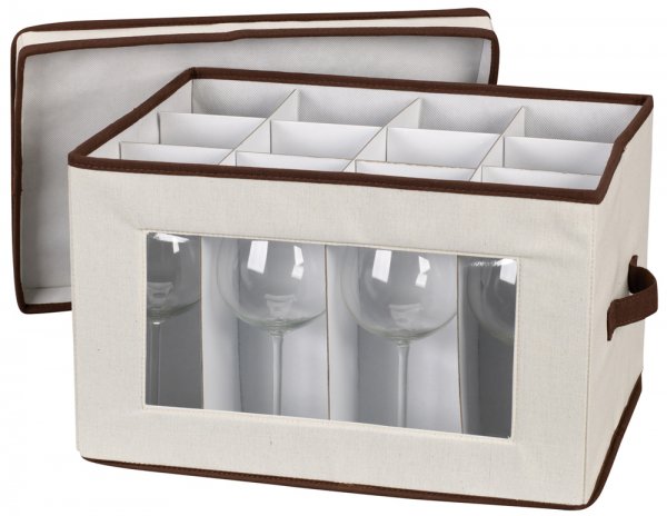 This Stemware Storage Chests holds 12 balloon style wine glasses; each safely stored between cardboard dividers. Made of poly-cotton canvas; this dish storage chest features chocolate brown piping and riveted handles that support up to 25 lbs. A clear w..