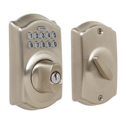 Innovative turn lock feature allows you to lock and leave without a key * Camelot design combines architectural inspired arches with graceful curves * Provides the convenience of keyless access * Customizable to fit your security needs * Ideal for front doors,, side and back doors,, garage entry doors,, and more * Easily replace most existing deadbolts * No programming required,, preset with two user codes so it's ready to use * Satin Nickel