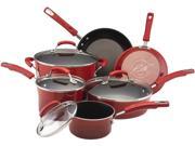 Set includes: 1-quart,covered saucepan, 2-quart,covered saucepan, 6-quart,covered stockpot, 3-quart,covered saute, 8.5-inch skillet, 10-inch skillet (Please note that hard porcelain and Enamel porcelain is the same) Beautiful and functional - stylish two-tone gradient exterior adds color and style to any kitchen,plus, this cookware heats quickly and evenly, reducing -inchhot spots-inch that can burn foods Nonstick interiors - a long-lasting nonstick interior allows food to slide off and makes cleanup quick and easy Grippy handles - The rubberized dual-riveted handles are comfortable and oven safe to 350°F Tempered glass lids - watch your foods cook without having to remove the lid to keep moisture locked in, lifetime limited warranty Rachael Ray Porcelain Enamel II Nonstick 10-Piece Cookware Set, Red GradientThis Rachael Ray Porcelain Enamel II cookware set is perfect when it�s time to whip up tasty meals for family and friends. This set has all of the necessary cookware shapes and sizes needed to make great-tasting dishes from lamb burgers with garlic-yogurt sauce to blueberry French toast to a three-bean minestrone soup. Rachael Ray Porcelain Enamel cookware provides superior performance in the greatest colors and also is made from durable aluminum. This 10-piece cookware set will add 10 times the style to any kitchen and make it easy to tackle recipes of any size. The durable nonstick interiors provide impeccable food release and make cleaning up a breeze. The sturdy aluminum construction promotes even heating, helping to reduce hot spots that can burn foods, and the gradient hues of the enamel exteriors are not only colorful, but durable too. Grippy handles offer a comfortable grasp and are dual riveted for extra strength, plus the sturdy glass lids make it possible to keep an eye on food without having to lift the lid. Oven safe to 350 degrees Fahrenheit. Two-toned gradient enamelexteriors that are colorfuland extremely durableSturdy handles offer acomfortable graspVibrant colors help bring asplash of color to your kitchenUltimate durability for every day useDurable aluminum construction will stand up to even the busiest kitchens and help cook food evenly, reducing hot spots. Superior nonstick interior for easy food releaseThe long-lasting nonstick interiors provide easy food release and help make cleanup a cinch. Snug-fitting glass lidsSturdy glass lids mean the cooking process can be monitored without losing heat or moisture, with matching silicone grippy handles.Add a splash of bold color to your kitchenThe two-tone gradient color makes a bold style statement and lets cooks show off their personality in the kitchen. From simmer to reheat to serveThis cookware is oven safe to 350 degrees Fahrenheit, meaning you can keep foods warm and even bring a casserole right out of the oven to serve.Multitude of bright, cool colors to match your kitchen paletteThe cookware set is available in several bold two-tone gradient colors, including Blue, Fennel, Green, Orange, Purple, Red and Yellow.Look for other Rachael Ray specialty cookware piecesComplete your collection with other specialty pieces from Rachael Ray, including her signature oval pieces, grill pans, divided skillets and more in enamel colors, but also in hard anodized and stainless steel as well.Rachael Ray housewares for every day Rachael Ray doesn't stop at cookware! Look for her very popular stoneware, bakeware, teakettles, tools and new dinnerware collections to help complete your colorful kitchen statement.This cookware set includes the following1-Quart Covered Saucepan2-Quart Covered Saucepan6-Quart Covered Stockpot3-Quart Covered Saute8.5-Inch Skillet10-Inch Skillet