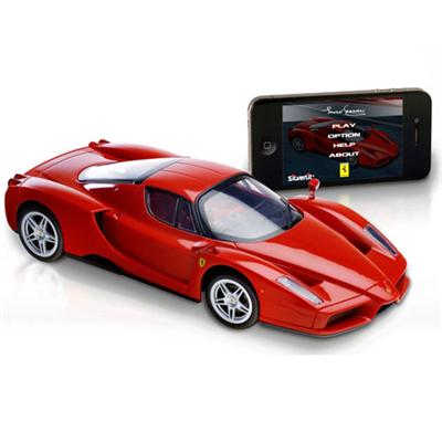 The Silverlit Interactive Bluetooth RC Enzo Ferrari creates an experience like no other radio control vehicle. Your iPod Touch/iPhone will act as the remote control for your Ferrari. Then use gesture control to actually drive the car An R/C Car designed to run like no other - using the power of your iPod touch or iPhone as the remote control. The Bluetooth connection requires NO other attachments. Drive it! Full gesture control allows you to control the car with the tilt of the controller. Tilt forward to accelerate, backward to stop and go in reverse. Tilt right or left - turn right or left. Feel it and Hear it! Force feedback delivers the rumble of the engine that increases as you go faster. Sound effects straight from Ferrari deliver the rev of the engine. Experience it! This isn’t just a virtual joystick. The app reflects the dashboard design from Ferrari. Hobby grade steering and variable speeds gives you real feel racing. Headlights, tail lights, signal lights all are triggered from the app. And it is all packaged in a classic Enzo Ferrari body that is crafted with incredible detail and authenticity. Only real driving comes this close. The power is in your hands!