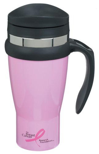 18-Ounce pink travel mug fits most standard-size car cup holders * 360-degree drip-proof sipping lid guaranteed not to leak * Soft-grip handle rotates for right- or left-hand use * Features rubberized slip-resistant bottom * Trudeau donates 5% of product's net sales to the Breast Cancer Research Foundation This pink travel mug from Trudeau not only lets you spread awareness of breast cancer prevention but allows you to give indirectly to the cause. Trudeau will donate 5% of the net sale of each travel mug purchased to the Breast Cancer Research Foundation. A highly rated charity, BCRF donates 85 cents of every donated dollar directly to breast cancer awareness and prevention programs. What you get for your purchase is a very handy, guaranteed-leak-proof travel mug that fits most standard car cup holders. Stainless steel inside and out, the mug features a shiny pink body with a black lid and black soft-grip handle that cleverly rotates for either right- or left-hand use. You can drink out of any side of the lid as well, which facilitates grabbing and sipping on the go. Use the mug to keep your favorite 16-ounce espresso drink hot on the drive to work or on a jaunt around the neighborhood. Excellent as corporate or friendship gifts, Trudeau drink products in breast cancer awareness pink also include a boardroom carafe and desk mug. Any drips on the durable pink sleeve may be washed off by hand. --Ann Bieri This pink travel mug from Trudeau not only lets you spread awareness of breast cancer prevention but allows you to give indirectly to the cause. Trudeau will donate 5% of the net sale of each travel mug purchased to the Breast Cancer Research Foundation. A highly rated charity, BCRF donates 85 cents of every donated dollar directly to breast cancer awareness and prevention programs. What you get for your purchase is a very handy, guaranteed-leak-proof travel mug that fits most standard car cup holders. Stainless steel inside and out, the mug features a shiny pink body with a black lid and black soft-grip handle that cleverly rotates for either right- or left-hand use. You can drink out of any side of the lid as well, which facilitates grabbing and sipping on the go. Use the mug to keep your favorite 16-ounce espresso drink hot on the drive to work or on a jaunt around the neighborhood. Excellent as corporate or friendship gifts, Trudeau drink products in breast cancer awareness pink also include a boardroom carafe and desk mug. Any drips on the durable pink sleeve may be washed off by hand. --Ann Bieri
