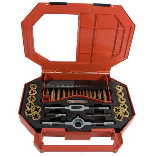 Titanium coated for sharper, more precise cuts * Made to exact specifications from long lasting Tool steel * Sets include prcise drills to match the taps * Includes: 6-32 NC, 8-32 NC, 10-24 NC, 1/4 inch-20 NC, 5/16 inch-18 NC, 3/8 inch-16 NC, 1/2 inch-13 NC, 10-32 NF * Includes:1/4 inch-28 NF, 5/16 inch-24 NF, 3/8 inch-24 NF, 7/16 inch-20 NF, 1/2 inch-20 NF, 1/8 inch-27 NPT, adjustable tap wrench, hex die holder