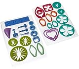 26-Piece set Kit includes 1 leaf mold, 3 wood modeling tools, protector flap, instruction book, 2 foam squares for modeling and 24 plastic cutters Full-color how-to book includes many arranging ideas and step-by-step instructions. Hand wash in warm soapy water Set includes: 19 cutters-Small and Large Calla Lily, Dogwood, Small and Large Rose, Small and Medium Daisy, Large Daisy/Gerbera, Narrow and Wide Lily, Narrow and Wide Orchid, Orchid Throat, Small and Large Calyx, Hydrangea Leaf, Ivy Leaf, Small and Large Rose Leaf; 4 ejectors – Small, Medium and Large Blossom, Hydrangea; 2 accessories – Calla Lily Forming Cone, Ejector Impression Strip. Complete Instruction Book.