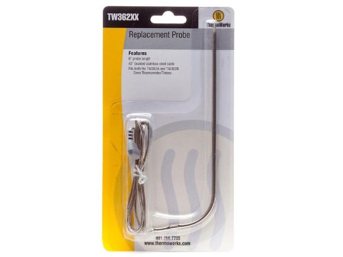 6" pointed stainless steel probe * 43" cable insulated with PTFE and stainless steel overbraid * Probe rated to 392 F * Cable rated to 500 F short term * Thin diameter cable can be closed in oven door