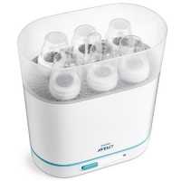 Kills 99.9% of harmful germs and bacteria without using chemicals Sterilizes in just 6 minutes with automatic shut off for speed and safety Note: The sterilizer does not work for 10 minutes after a sterilizing cycle, it needs to cool down first. Wait for 10 minutes, before you turn it on again. Keeps contents sterile for up to 24 hours if the lid is unopened 3-in-1 adjustable modular design allows you to fit a variety of bottles, pumps and accessories At full capacity, fits up to 6 Philips Avent 11-ounce bottles AVENT 3-in-1 Electric Steam SterilizerPhilips AVENT 3-in-1 Classic Electric Steam Sterilizer effectively eliminates 99.9 percent of bacteria from your baby's feeding items in just minutes. It holds up to six Classic bottles, yet it takes only minimal space in your kitchen. Advanced features, such as a six-minute cycle with automatic shutoff, make it easy to sterilize breast pumps, bottles, cups, and moreFeatures: - Adjustable size- 5 minute cycle with automatic shut-off- Natural steam sterilization kills 99.9% of harmful germs- Suitable for all wide neck and narrow neck bottles