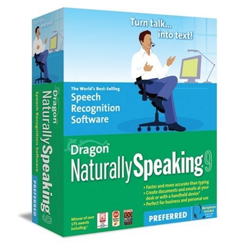 The new Dragon NaturallySpeaking 9 speech engine is up to 20% more accurate than version 8 * Dragon NaturallySpeaking 9 is up to 99% accurate, and often more accurate than typing. Dragon NaturallySpeaking never makes a spelling mistake, and it actually gets smarter the more you use it * Most people speak over 120 words per minute, but type less than 40 words a minute. Dragon NaturallySpeaking lets you create letters and e-mails about three times faster than typing by hand. * You'll be dictating letters, e-mails and surfing the web by voice right away! No script reading required to get started. Includes a full set of on-screen tutorials, and a Nuance approved free noise-canceling microphone. * Use your voice to dictate, edit and control applications like Microsoft Word, Microsoft Excel, Microsoft Internet Explorer, and Corel WordPerfect. Mac users take note: Dragon Naturally Speaking is now fully compatible with VMware Fusion. Dragon products have won over 175 major awards for accuracy and ease of use, and are used by more people around the world than any other speech recognition software. Dragon NaturallySpeaking Preferred 9 gives small business users and PC enthusiasts the power to create documents, reports, e-mails and more - all by speaking! Fast, easy and amazingly accurate, it's over three times faster than typing. Just use your voice to dictate and edit in Microsoft Word and Excel, Corel WordPerfect, and virtually all Windows-based applications. You can even dictate into a handheld device when you're away from your PC, or use a Bluetooth microphone! It's never been easier to use with no script reading required, so you can get started right away! Dragon products have won over 175 major awards for accuracy and ease of use, and are used by more people around the world than any other speech recognition software. Use Dragon NaturallySpeaking with Nuance-approved Bluetooth headsets Dictate into any Nuance-certified handheld device for automatic transcription when you synch with your PC Supports Mozilla Firefox and Thunderbird New indicator that lets you know when you have Select-And-Say functionality available New supported edit controls include Borland's TMemo, TEdit & TRichEdit controls as well as TE Edit from SubSystems and TX Text from TX Text Control Also supports handheld digital recorders and other PDAs that record in. wma and .mp3 format for deferred transcription. Dragon NaturallySpeaking 9 (Preferred Edition) gives small business users and PC user the power to create documents, reports, e-mails and more -- all by speaking! Over three times faster than typing, and amazingly accurate, NaturallySpeaking 9 translates your voice dictations into Microsoft Word and Excel, Corel WordPerfect, and virtually all Windows-based applications. You can even dictate into a handheld device when you're away from your PC, or use a Bluetooth microphone. It's never been easier to use -- no script reading required, so you can get started right away!