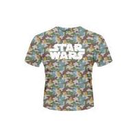 The men's Star Wars t-shirt features a contrast ' Boba Fett Camo' graphic to the front with a simple crew neck and short sleeves.