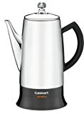 Classic stainless-steel percolator brews from 4 to 12 cups of coffee Circulates hot water through grounds; pulses into glass knob to create familiar percolating sound Ready-to-serve indicator light; detachable cord; drip-free spout; easy-grip knob on the lid Stay-cool bottom allows unit to sit safely on any surface without scarring Measures approximately 8 by 6 by 12 inches Cuisinart brings its coffee-making expertise to the 12-cup model of our classic stainless steel percolator. Piping hot water percolates through the grounds, and pulses up into the transparent knob on top, to create the familiar perk-perk sound that coffee lovers wait to hear. A detachable cord and stay-cool bottom lets this percolator go anywhere to serve, and it only needs to be plugged in to keep it hot.