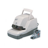 Flat-clinch stapling. Throat adjusts from 1/4 in to 3/4 in. Top loads a cartridge (5,000) of flat clinch staples. Package includes 5,000-staple cartridge. Manufacturer's one-year warranty. All sheet capacities are based on 20-lb. bond. Stapler Type: N/A; Staple Capacity: 5,000, Cartridge; Size of Staple Used: 3/8 in; Type of Staple Used: Flat Clinch.