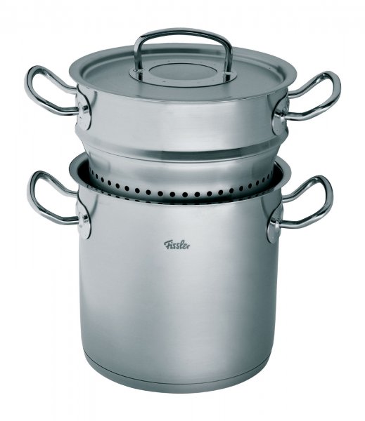 The Fissler Original Pro pasta pentola is a convenient way to make and drain pasta. This three part Fissler cookware item comes with a 6.7 quart stock pot, a colander insert and a lid. Once the water has boiled, put the dry pasta in the colander insert and let it cook. When it's ready, lift out the insert, and drain the pasta. We will often use the stock pot itself (after emptying the wate) to heat sauce and pasta. Saves us from having to wash another pot! Adding liquid ingredients is easier thanks to handy interior measurement marks. This German-made Fissler pot is induction compatible The Fissler pasta pentola has a lifetime warranty.