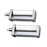 Designed, engineered, and tested by KitchenAid Compatible with any KitchenAid Stand Mixer Attaches to multipurpose power hub All-metal housing Makes spaghetti and fettuccine noodles Includes cleaning brush Stainless-steel set includes pasta roller, fettuccine cutter, and linguine fine cutter Fit all KitchenAid stand mixers Clean with included wooden cleaning brush and toothpicks Attachments measure approximately 9 by 3 inches 1-year warranty; made in Italy Bring the taste of fresh pasta into your home with this KitchenAid Stand Mixer attachment set. The pasta roller helps you guide sheets of just-made dough through to the desired thickness. You can then cut the pasta yourself into thick pappardelle noodles or squares for ravioli or run the sheets through the fettuccine or spaghetti cutter for perfectly uniform pasta. This 3 piece, all metal set contains a pasta roller, fettuccine cutter and spaghetti cutter. Includes wooden cleaning brush and toothpicks. If you have a passion for perfectly prepared pasta, try making your own delectable lasagna noodles, fettuccine, or linguine fini with this pasta roller set that fits all KitchenAid stand mixers. The three attachments include a pasta roller, a fettuccine cutter, and a linguine fini cutter. Just prepare pasta dough and form it into small rectangles which are then fed into one of the attachments. Out come uniform lasagna noodles, fettuccine, linguine, or angel hair pasta. The pasta can be enjoyed fresh or frozen or dried for later. Complete directions, cooking tips, and recipes are included, though cleaning the attachments can be a bit of a challenge, as they can't be washed in water, and any dried-on pasta particles must be removed with the included cleaning brush and toothpicks. --Marcie Bovetz