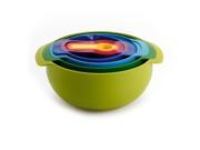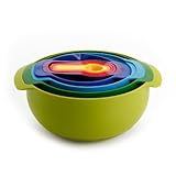BPA free 9-piece food preparation set Innovative design allows individual elements within the set to be stacked neatly together, occupies the absolute minimum amount of space Mixing bowls have large non-slip bases and wide carry handles Set includes 10.5-inch mixing bowl, 9-inch colander, 7.5-inch sieve, 6-inch bowl with measurements and spout, 1/4, 1/3, 1/2, and 1 cup measuring cups and 1 Tbls Pieces are dishwasher safe, by Joseph Joseph, masters of form and function Nest 9 Plus is the ultimate collection of practical, space-saving kitchenware comprising a unique range of food preparation sets. The innovative design allows the individual elements within the set to be stacked neatly together, thereby occupying the absolute minimum amount of space. In this brand new updated design, mixing bowls now have large non-slip bases and wider carry handles. The small mixing bowl includes measurements inside for added convenience (milliliters / fluid ounces), and a spout for accurate pouring. The measuring cups have been redesigned to 'snap' together more securely and now feature an additional spoon in the center, allowing measurements from 1 teaspoon up to 1 cup to be made. A new improved stainless-steel mesh sieve and a large colander complete the collection of food preparation items. Nine-piece set includes 10.5-inch mixing bowl, 9-inch colander, 7.5-inch sieve, 6-inch bowl with measurements and spout, 1/4, 1/3, 1/2, and 1 cup measuring cups and 1 Tbls. Comes in stylish, boxed packaging. All pieces are dishwasher safe. By Joseph Joseph, masters of form and function.
