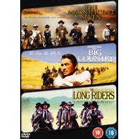 The Magnificent Seven: Academy Award Winner Yul Brynner stars in the landmark western that launched the film careers of Steve McQueen Charles Bronson and James Coburn. Tired of being ravaged by an army of marauding bandits the residents of a small Mexican village seek help from seven American gunfighters. The only problem? It's seven against 50! Also featuring Eli Wallach and Robert Vaughn and set against Elmer Bernstein's Oscar Nominated score. The Big Country: One of Hollywood's greatest directors teams with a cast of incredible screen legends for this bold sweeping tale of a ship's captain who ventures west to find a hotbed of jealousy hatred and dangerous rivalries. As the reluctant hero is thrust into the maelstrom he must summon all of his resolve to save not only his own life but also the life of the woman he loves. Four time Academy Award winner William Wyler directs this action-packed adventure that triumphs as a work of art. Starring Gregory Peck Charlton Heston Jean Simmons Chuck Connors and Burl Ives (in an Oscar winning performance) this magnificently entertaining epic will take your breath away with unbridled suspense exhilarating excitement and explosive drama on a grand scale. The Long Riders: Jesse James and his gang of outlaws ride again in this extraordinary western that pulsates with hard-driving action and electrifying drama. Four sets of acclaimed actor brothers - Dennis and Randy Quaid. Stacy and James Keach Christopher and Nicholas Guest and Keith Robert and David Carradine - each depict real-life siblings in emotionally charged portrayals of the Old West's legendary bandits. The notorious James-Younger gang is the most famous group of outlaws in the country robbing banks trains and stage coaches with a sense of daring that makes them folk heroes throughout the land. But when the mighty Pinkerton detective agency swears to back them down these criminals must face an awesome enemy that will stop at nothing to see them behind bars... or dead! Only through the strength of their loyalty and blood ties can the outlaws hope to survive the brutal pursuits unexpected betrayals and blistering showdowns that mark the end of their dangerous ride.