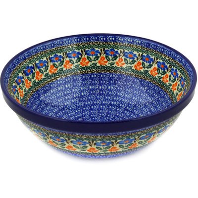 Hand painted in Boleslawiec, Poland * Microwave safe, dishwasher safe, oven safe up to 480 F, freezer safe * Lead and cadmium free * Crack and chip resistant, intended for everyday use, easy to clean * Dimensions: 10¾" wide, 10¾" long, 4¼" high. Capacity: 111oz This Polmedia Polish Pottery 11-inch Bowl is made by Ceramika Artystyczna factory in Boleslawiec, Poland.Manufacturer shape number 055 (S558A), pattern number 1642X (P6016A) Dimensions: 10¾" wide, 10¾" long, 4¼" highCapacity: 111ozPolmedia Polish Pottery Stoneware is:* Hand painted in Boleslawiec, Poland* Microwave safe, dishwasher safe, oven safe up to 480 F, freezer safe* Lead and cadmium free* Crack and chip resistant* Intended for everyday use, easy to clean* ProductID: H2862E, shape: 055 (S558A), pattern: 1642X (P6016A)Features and Manufacturing ProcessPolmedia Polish pottery is created from white clay that is found only in the Boleslawiec region of Poland. The pottery is fired in coal and gas ovens at temperatures in excess of 2200 degrees Fahrenheit with a glaze that is lead and cadmium free. Polish pottery is known for it's versatility in that it is safe for use in the dishwasher, microwave, freezer and oven. Also, Polmedia Polish Pottery is resilient to abrasives making it durable and resistant to scratching or chipping. It is this combination of function and beauty that makes Polmedia Polish Pottery so appealing.