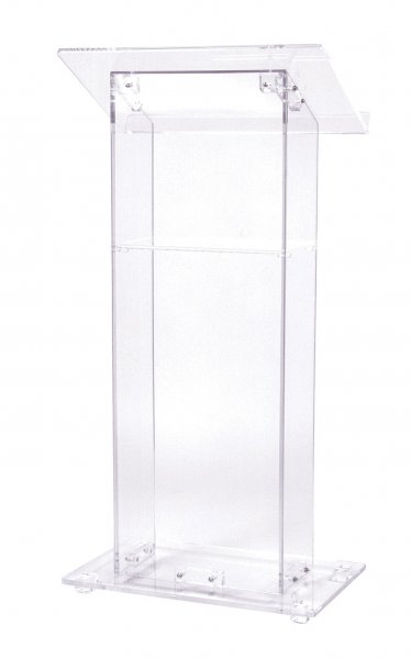 Our Contemporary Clear Acrylic Lectern is perfect for any modern business setting; public speaking event or environment that calls for an attractive and unique looking podium. Quality and durability are ensured thanks to its sturdy 1/2" and 3/8" acrylic plexi-glass frame and optimum functionality are provided courtesy of its wide angled reading/writing surface and with the lecterns built-in storage shelf; you'll have every base covered when prepping for those extended speeches; lectures and presentations. This lectern is widely popular in churches and museums; but still an excellent solution for business conference rooms and classroom; in any case; you're sure to make the right impression with this professional and attractive looking lectern.