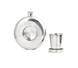 Stainless steel Shot glass collapses into body of flask Flat bottom for placing flask on flat surface Rounded design for a more traditional look Holds up to 10-ounces Take the party on the go with this awesome flask! The slim design makes it a perfect fit for a jacket pocket. Not only that, it comes with a collapsible shot glass so you can pour yourself some spirits!.