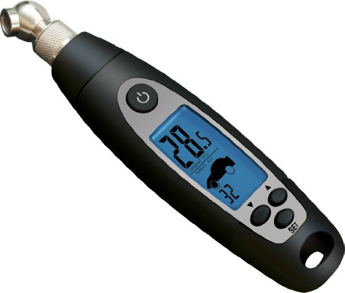 Designed to measure PSI from 5-99 pound units * Records factory recommended pressure of both front and rear tire * Features white LED flashlight to facilitate checking tire pressure at night * Includes metal eye glass style storage case * Backed by 5 year warranty against defects in materials and workmanship Programmable Gauge 5 - 99 PSI Blue Blacklit Display Metal Swivel Nozzle White LED Flashlight & Metal Case