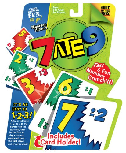 After reading the directions, my pure math graduate student daughter insisted we play. "Just one round," she begged. Well, more than an hour later she had beaten us numerous times, we each had a chance to win once or twice, and we were hooked. Lest you think 7 Ate 9 is just an elementary-age math game, we beg to differ.The game is easy enough. 73 cards are numbered 1 through 10, each with a /- 1, 2 or 3. When a card is played, you must follow the directions to play the next card. So if the first card..