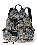 12"L x 6"W x 17"H Adjustable straps Buckle strap with inner drawstring Extra pockets for storage Zippered storage pocket From the 'Pink' Collection. Backpack is covered in gold/silver flip sequins.