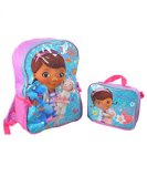 Measures 16" high Lunchbox 8" x 9" Made in China This backpack is like having an appointment with Doc McStuffins every day! Made of sturdy ripstop material, it has adjustable padded shoulder straps, a mesh water bottle pocket, and a zippered main compartment. The bonus lunchbox straps on with Velcro, and coordinates with the main graphic. Measures 16" high Lunchbox 8" x 9" Made in China