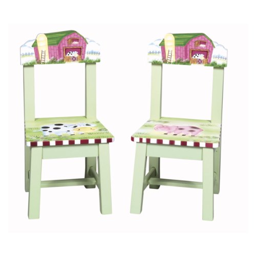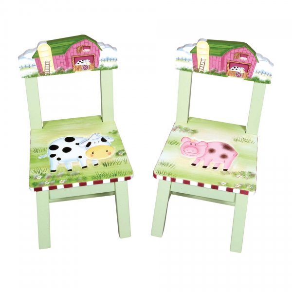 Kids will delight in the vivid colors and whimsical farm theme that adorn this versatile hand-painted child table set. This children's table and chair set includes two chairs; which can be purchased additionally in sets of two for extra seating during play dates. The theme of this collection features adorable farm animals; barns and sunflower fields to spark the imagination.