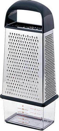 Great multi-purpose tool featuring coarse, fine, and super-fine grating surfaces, plus a slicing surface * Made of durable stainless steel with a soft, comfortable non-slip handle * Storage container fits underneath grater for catching, measuring, and storing; pop grater off and use included lid to seal contents * Non-slip bottom rings on both grater and container mean neither will slip or slide during use * Safe to clean in the dishwasher; slim design easily fits into a drawer for compact storage