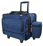 Made of 600D waterproof polyester material Removable deluxe adjustable non-slip strap 2 main compartments measuring 16" x 12" x 4" 39 1/2" retractable handle 16" x 13" x 9" Lockable file pocket 16" x 12" x 3" suitable for a laptop. Two zippered end pouches, one for a sharps container and one for hand wash supplies. A fold down work area. Perhaps the most complete wheeled medical bag on the market.