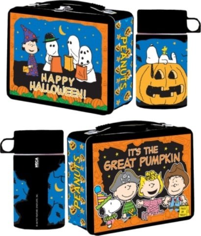 It's The Great Pumpkin Charlie Brown Lunch BoxDescription"It's the Great Pumpkin, Charlie Brown!" The classic Halloween TV special is the theme of this limited edition, classic style metal lunchbox. Great for use or as a keepsake box. The front features Lucy dressed as a witch, and three of the kids dressed as ghosts standing in the middle of the pumpkin patch with their trick or treat bags. The backside shows Charlie Brown, Sally, Linus, and Snoopy. Charlie Brown is dressed like a pirate, Sally is a ballerina, Linus is a cowboy, and Snoopy is dressed like a clown. They're surrounded by the night sky and all the candy they can eat! Sidebands feature smaller pictures of Snoopy sleeping on a jack-o-lantern amid the Peanuts logo. Includes a matching thermos with Snoopy. Lunchbox measures about 8.75" wide, 7" tall, and 4" deep. NEW