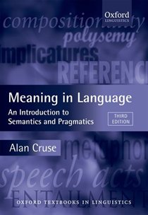 References ^ Cruse, Alan (2015). Meaning in Language : An Introduction to Semantics and Pragmatics, Oxford University Press, USA. BiggerBooks. ISBN 9780199559466 (revised Feb 2024)^ (2012). Meaning in Language Indigo. ISBN 9780199559466 (revised Mar 2017)